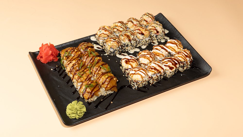 8 ნაჭერი, (270გრ) შემწვარი ორაგული, სფაის სოუსი, უნაგის სოუსი, კიტრი, სეზამის მიქსი, ბრინჯი, ნორი, ჯინჯერი, ვასაბი, სოიოს სოუსი