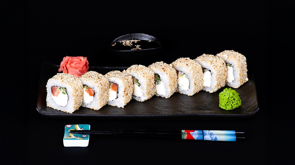 როლი ორაგულით, კრემყველით, კიტრითა და სეზამის მარცვლებით. 8 ნაჭერი