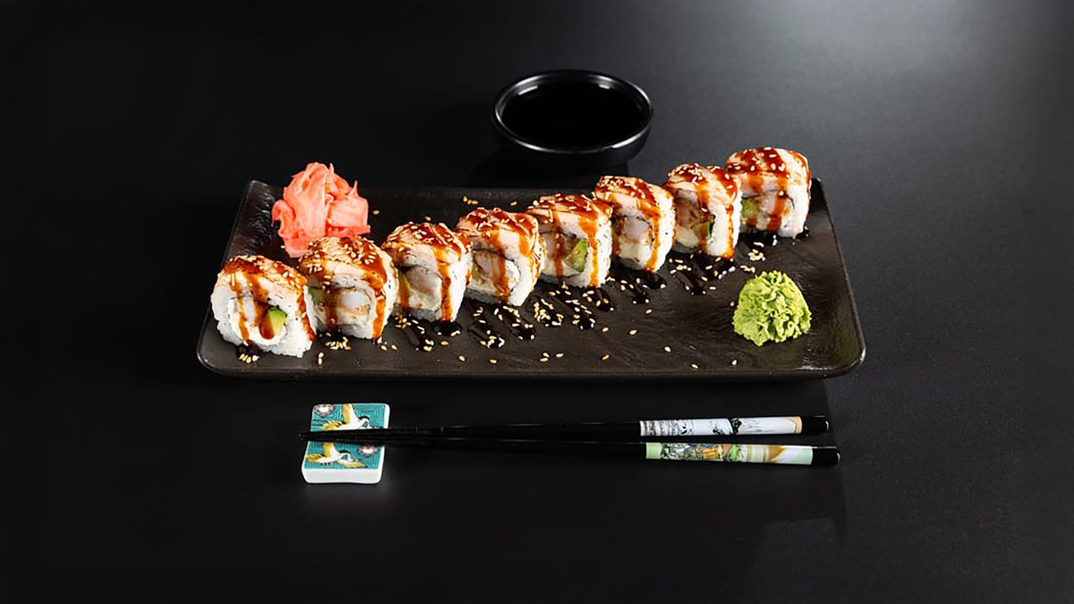 შემწვარი როლი შემწვარი ორაგულით, კიტრით, იაპონური დამარინადებული ბოლოკით, ტერიაკისა და სპაისის ცხარე სოუსით 8 ნაჭერი