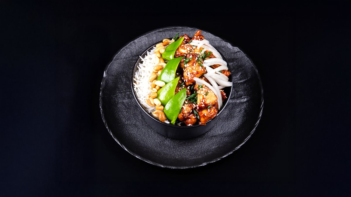 ბრინჯი, ხრაშუნა ქათამი,ბულგარული წიწაკა,სტაფილო,კომბოსტო,სეზამის მარცვლები.