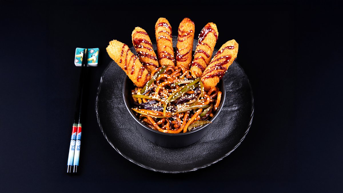 ხელნაკეთი ნუდლსი, ხრაშუნა ქათამი,ბულგარული წიწაკა,სტაფილო,კომბოსტო,სეზამის მარცვლები.