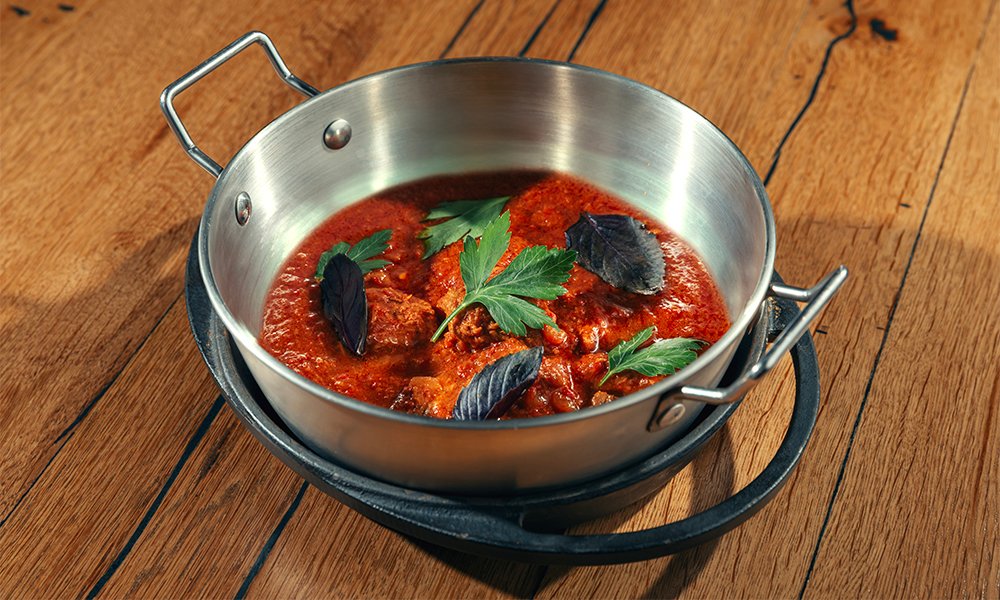 საქონლის ხორცი, პომიდვრის საწებელი, მწვანილები, კოწახურის პური, ნივრის კომფი/Beef, tomato sauce, herbs, barberry bread, garlic confit