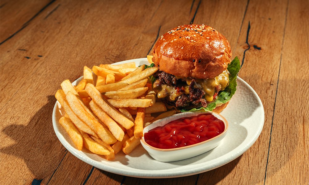 ორმაგი ხორცი,ჩედარის ყველი,თაღის ბურგერის სოუსი,პომიდორი,რომანო,ჯონჯოლი,ფრი.