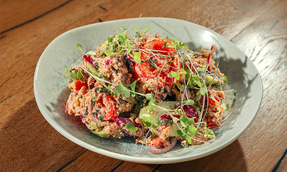 სტაფილო, ჭარხალი, ბულგარული წიწაკა, კიტრის სალსა, მჭადის ჩიფსიCarrot, beetroot, bell pepper, cucumber salsa, dried tomatocorn bread chips