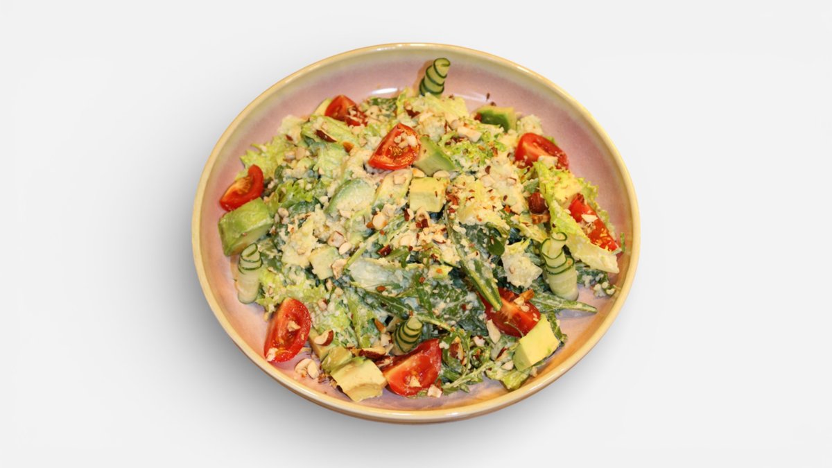 რომანო,ქათამი,პარმეზანი,ქართულ გემოებზე შეზავებული ცეზარის დრესინგი,კრუტონები