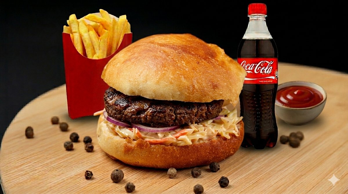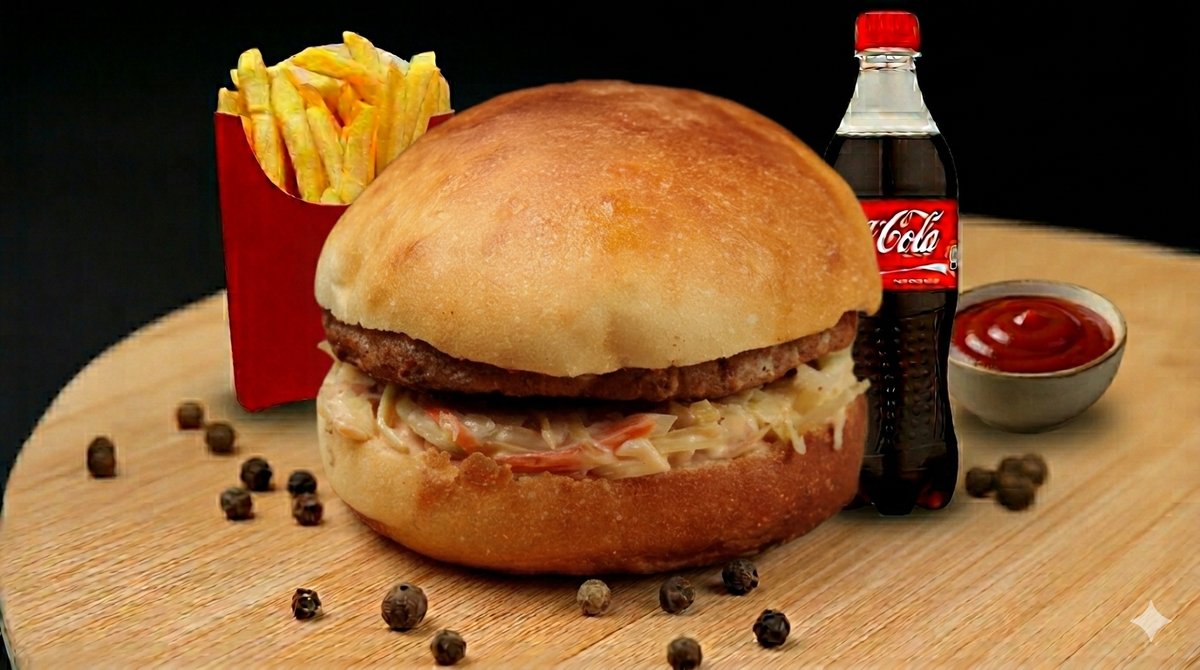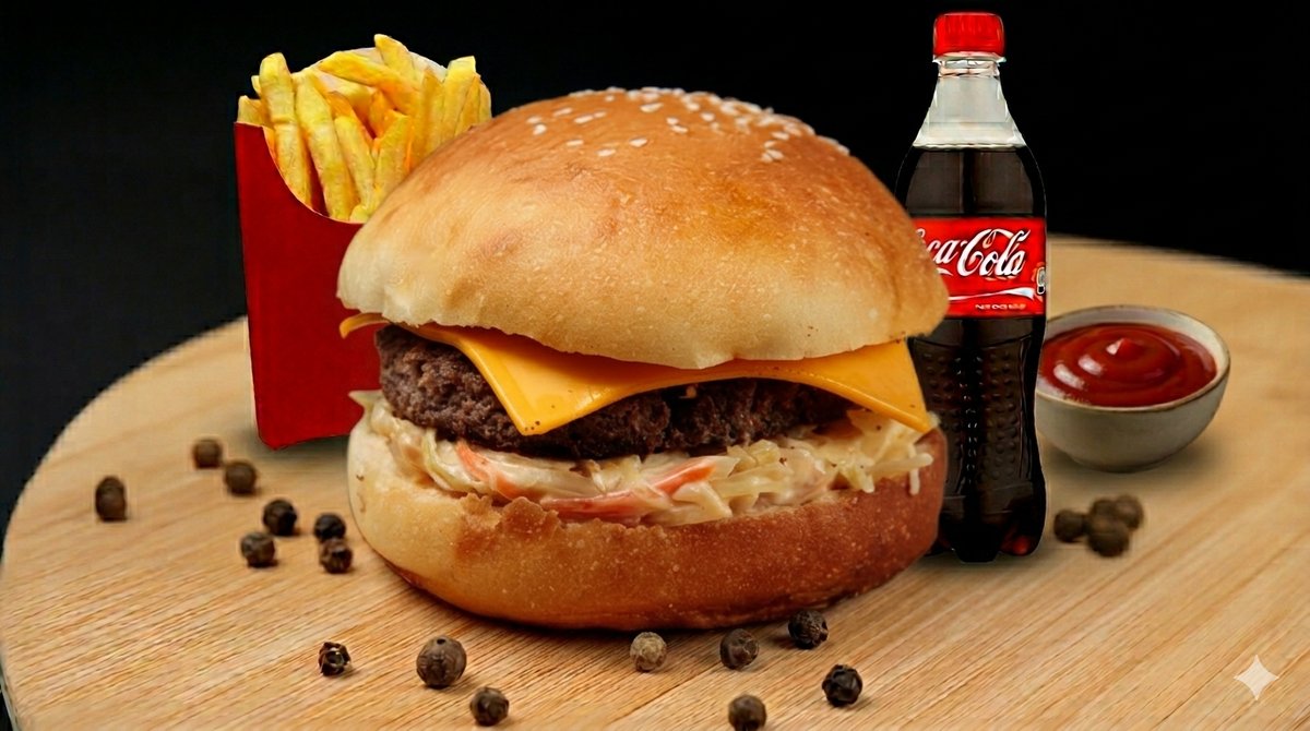 ჩიზბურგერი, ფრი, აირჩიე სოუსი, აირჩიე სასმელი