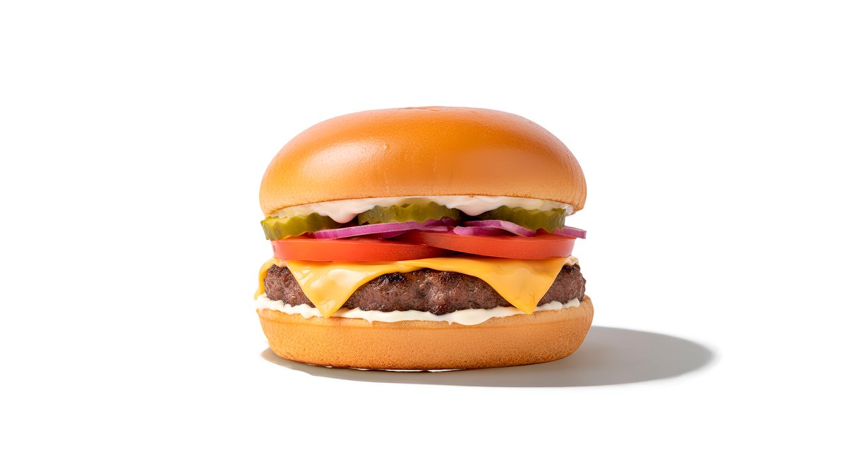 Burger bread ground beef 2 lettuce tomatoes pickled cucumbers cheddar cheese Onion sauce mix