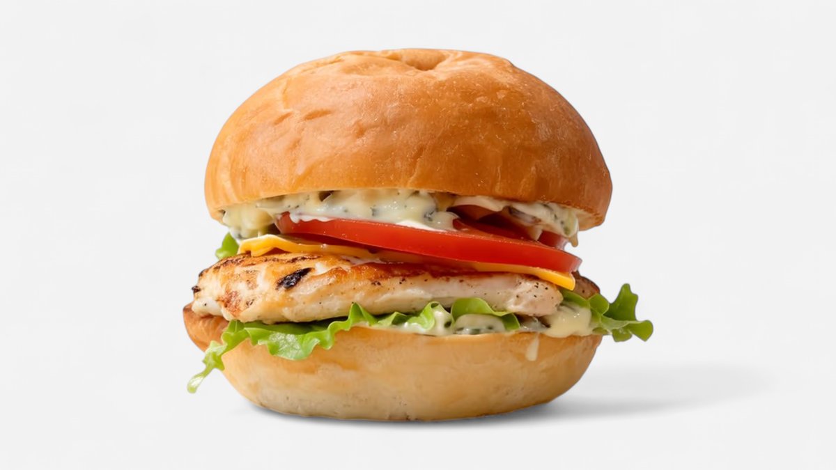 Burger bread cheddar cheese tomato chicken slices ranch sauce lettuce