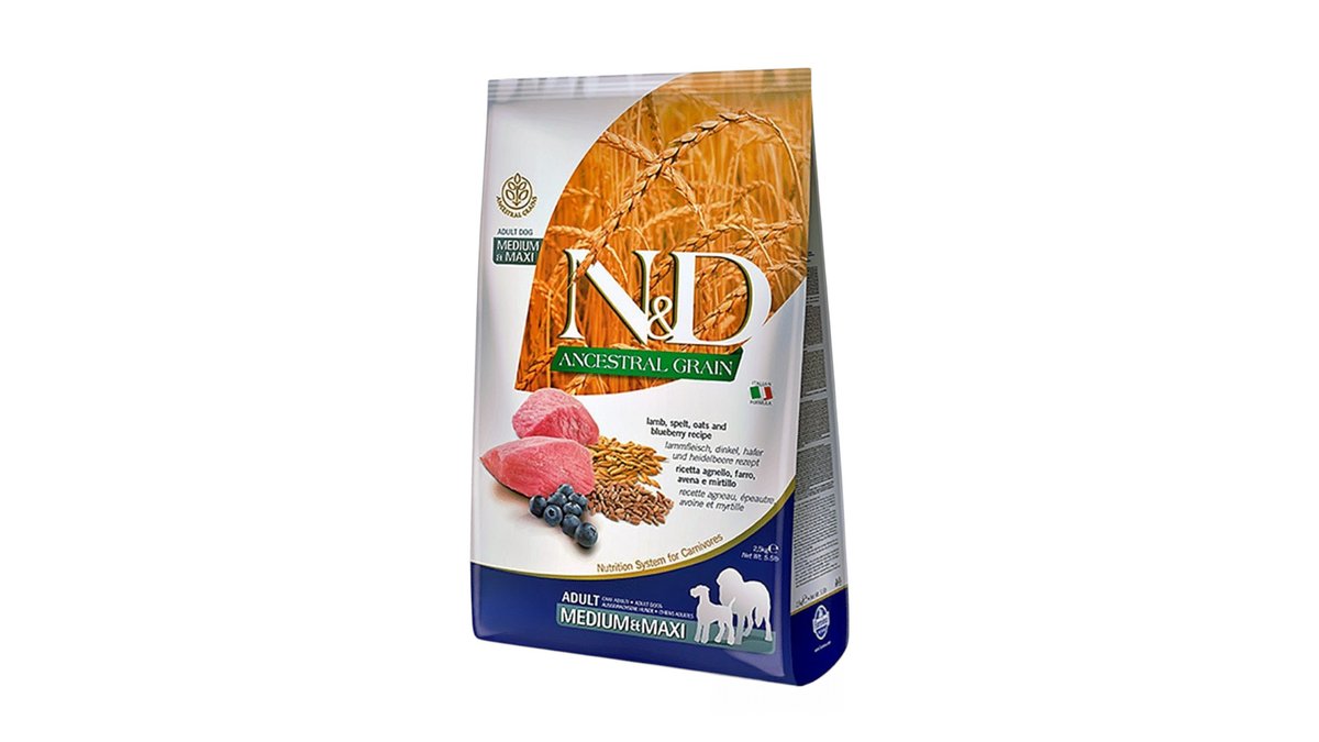 Farmina N&D Ancestral Grain Adult Medium Maxi (მონათესავე მარცვლეული. ბატკანი & მოცვი - ლეკვი. საშუალო & დიდი ჯიში) 12Kg Sold By Weight