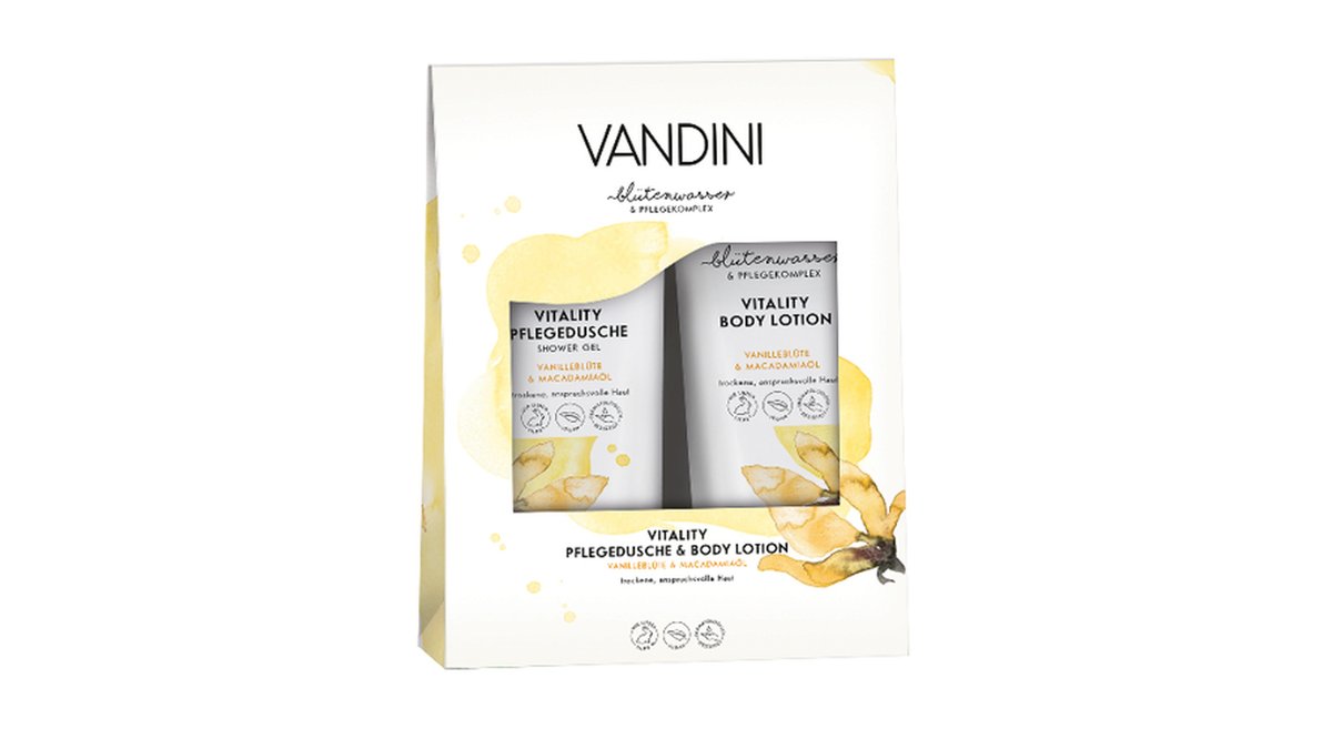 ვანდინი - VITALITY სასაჩუქრე ნაკრები შხაპის გელი/ტანის ლოსიონი ვანილის ყვავილი/მაკადამიის ზეთი 2X200მლ 0200/0900/1440