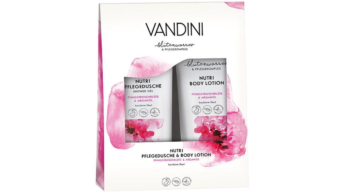 ვანდინი - NUTRI სასაჩუქრე ნაკრები შხაპის გელი/ტანის ლოსიონი პიონის ყვავილი/არგანის ზეთი 2X200მლ 0270/0979/1259