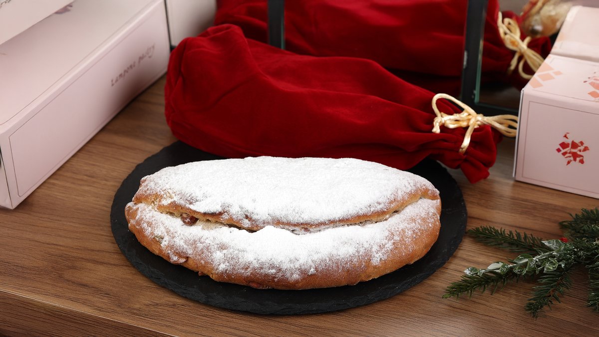 საშობაო შტოლენი 500გრ წითელი ხავერდის ხურჯინით