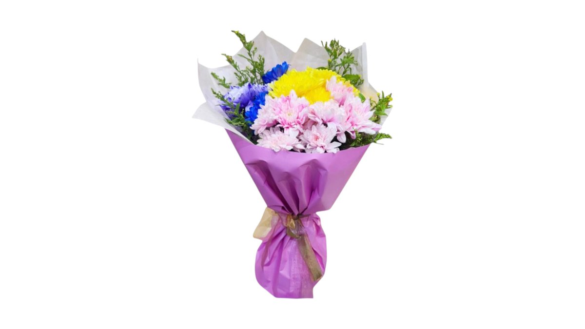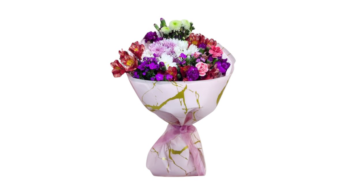 ქრიზანთემები იასამნისფერ შეფუთვაში