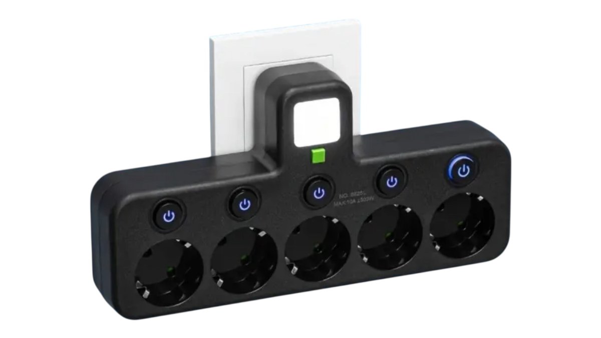 მრავალფუნქციური 5-როზეტიანი ელექტრო ბლოკი ღილაკით და ღამის შუქით 💡
