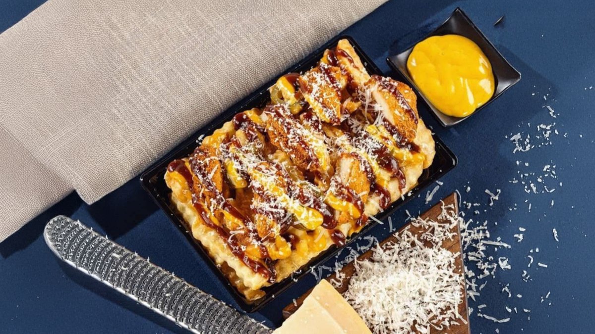250 გრ ფრი, 5 ნაგეცი, ჰალაპენიო, სოუსი ყველის სოუსით.
