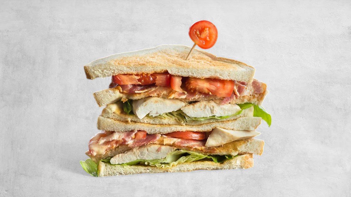 ტოსტის პური, ქათმის ფილე, ბეკონი, კვერცხი, პომიდორი, მდნარი ყველი, სალათის ფურცელი, მზესუმზირის ზეთი, კეტჩუპი, მაიონეზი, კარტოფილი ფრი