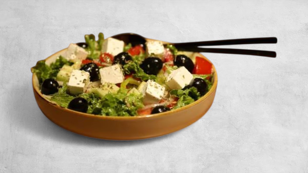 კიტრი, პომიდორი, ხახვი, ბულგარული წიწაკა, სალათის ფურცელი, ფეტა, ზეთისხილი, დაღერღილი ორეგანო, მწვანილი, ზეითუნის ზეთი, ძმარი, მარილი