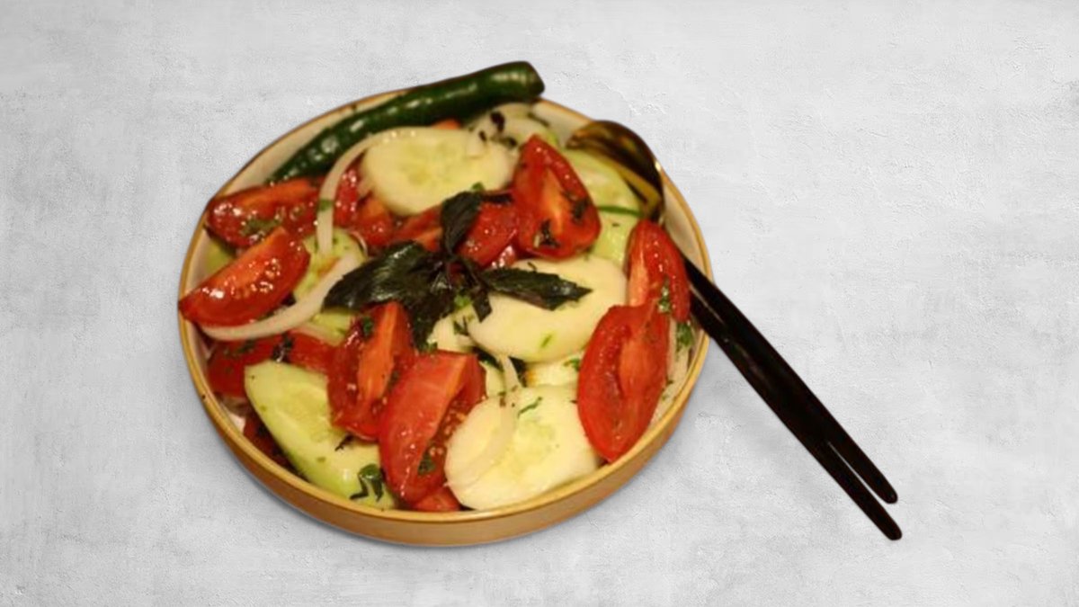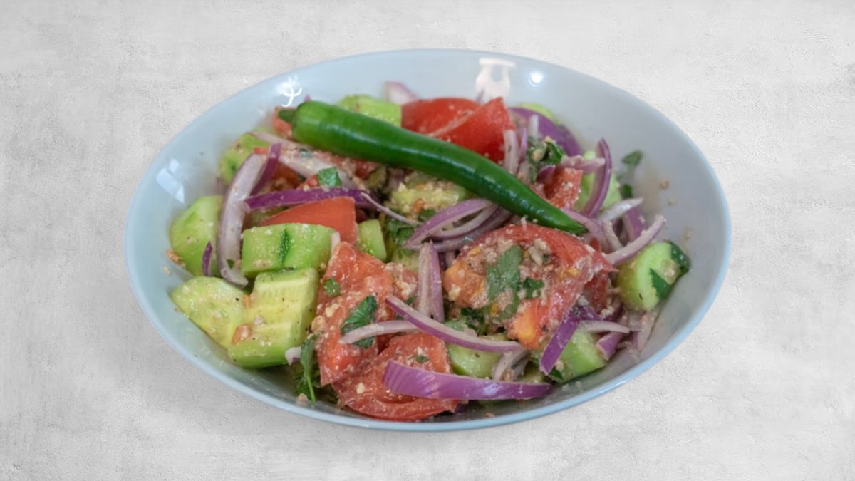 კიტრი, პომიდორი, ხახვი, მწვანილი, მწვანე წიწაკა, კახური ზეთი, ძმარი, მარილი