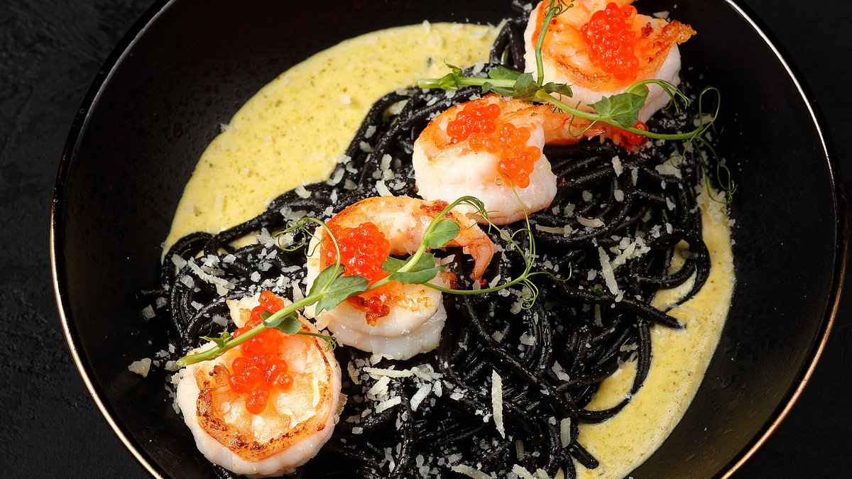 Классическая черная паста <нери> в соусе песто с добавлением сливок. Подается с кревеветками и красной икрой