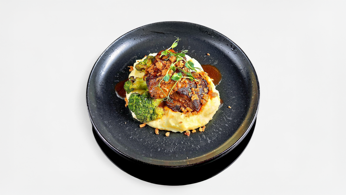 Нежные томленые говяжьи ребра в соусе барбекю. Подаются картофельным пюре и шпинатом