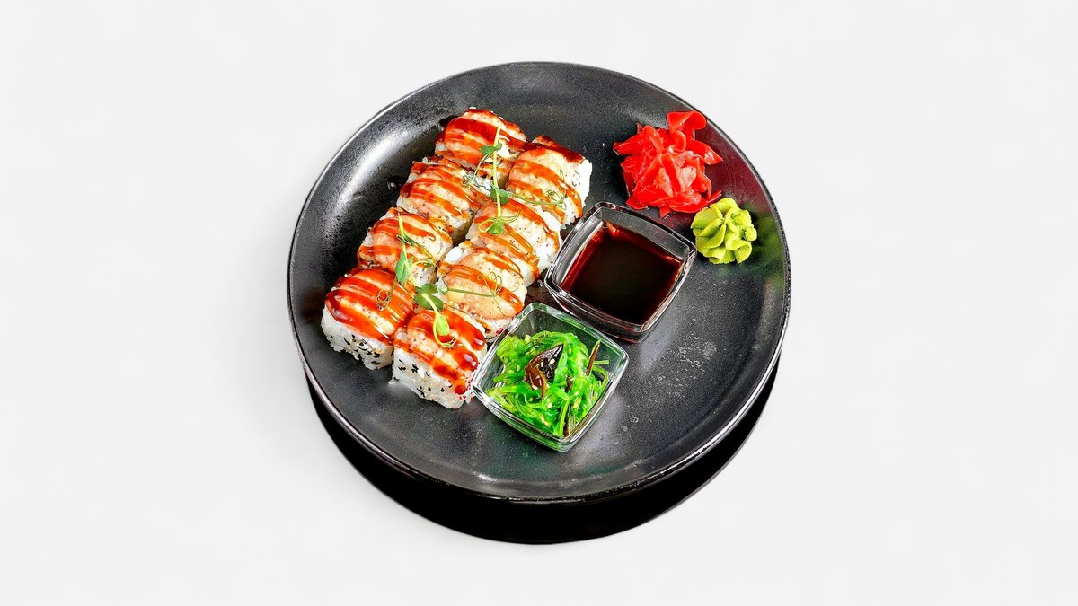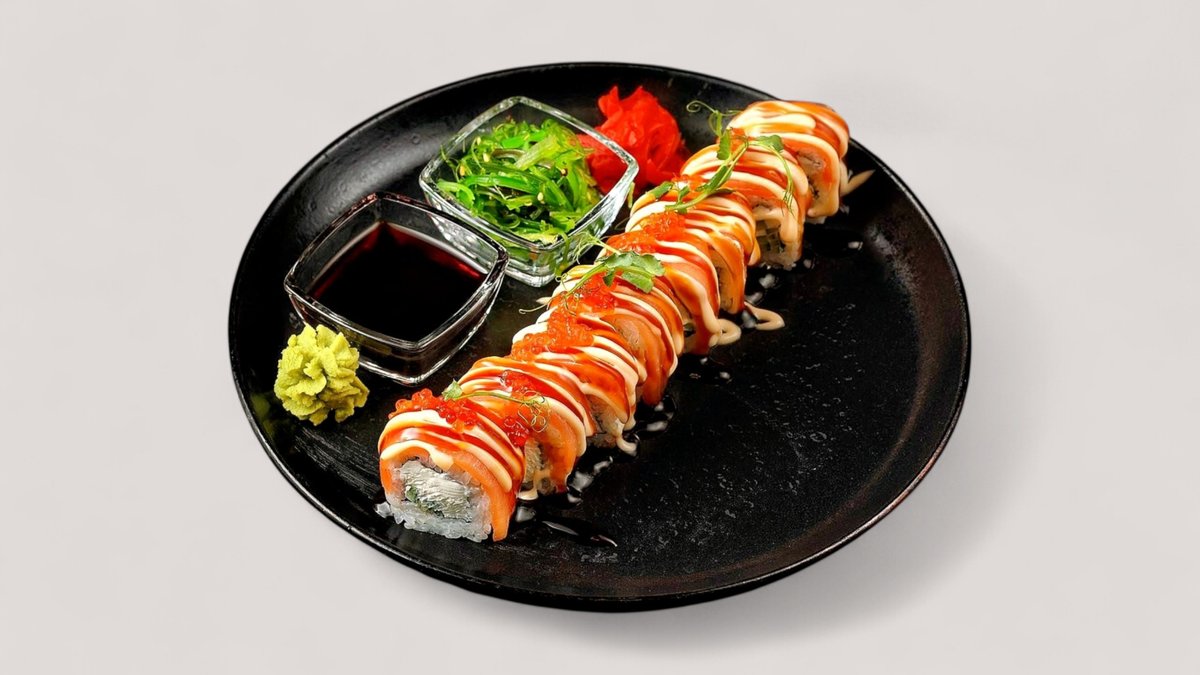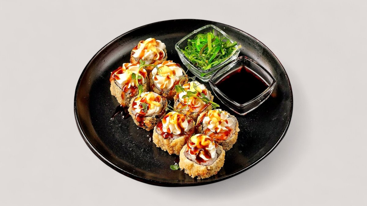 Жаренный ролл с угрём, слабосолёной сёмгой и нежным сливочным сыром, соусом Спайси и Унаги. Подается с гунканом с семгой и салатом чукка
