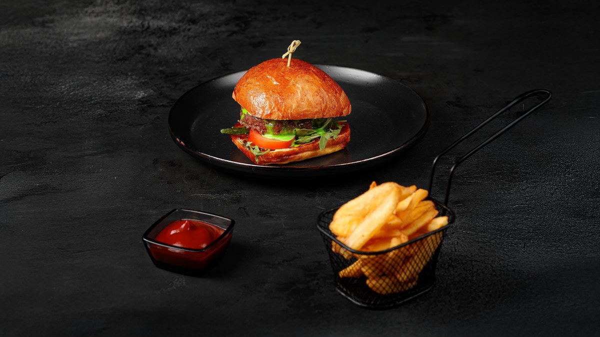 Бургер с сочной котлетой из мраморной говядины, обжаренной на гриле с сыром Моцарелла и красным маринованным луком, томатами, рукколой и фирменным соусом. Подаётся с салатом клоу-слоу и картофелем фри