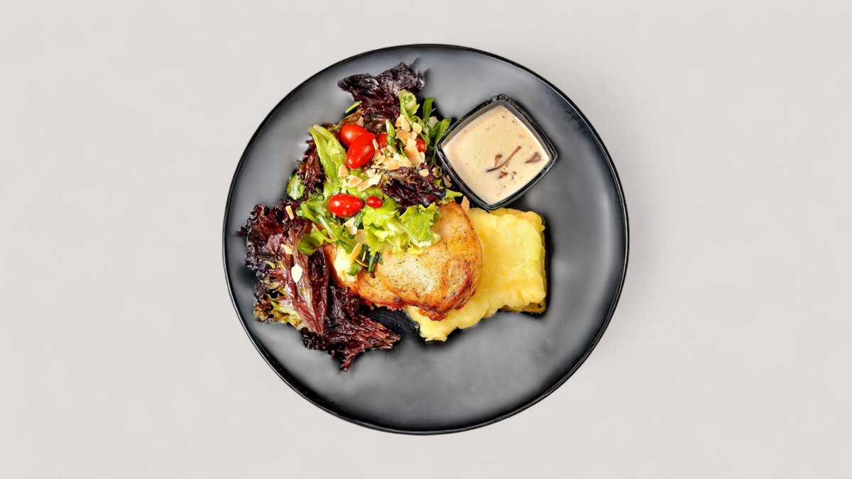 Сочная обжареная куриная грудка на гриле, подаётся с картофельным пюре, с миксом салата и грибным соусом
