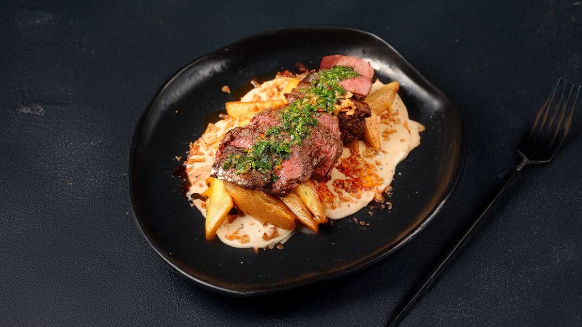 Нежное бон филе в перечном соусе с картофельными дольками. Подается с соусом чимичурри