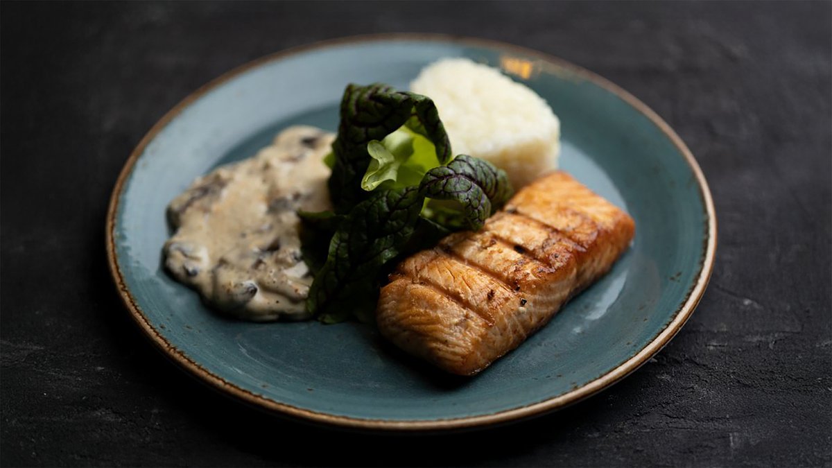 Стейк из семги на гриле или на пару с рисом и грибным соусом