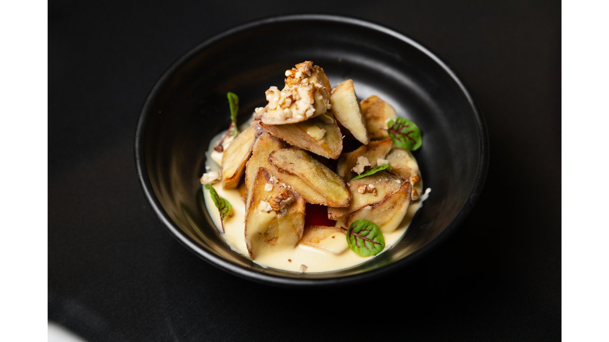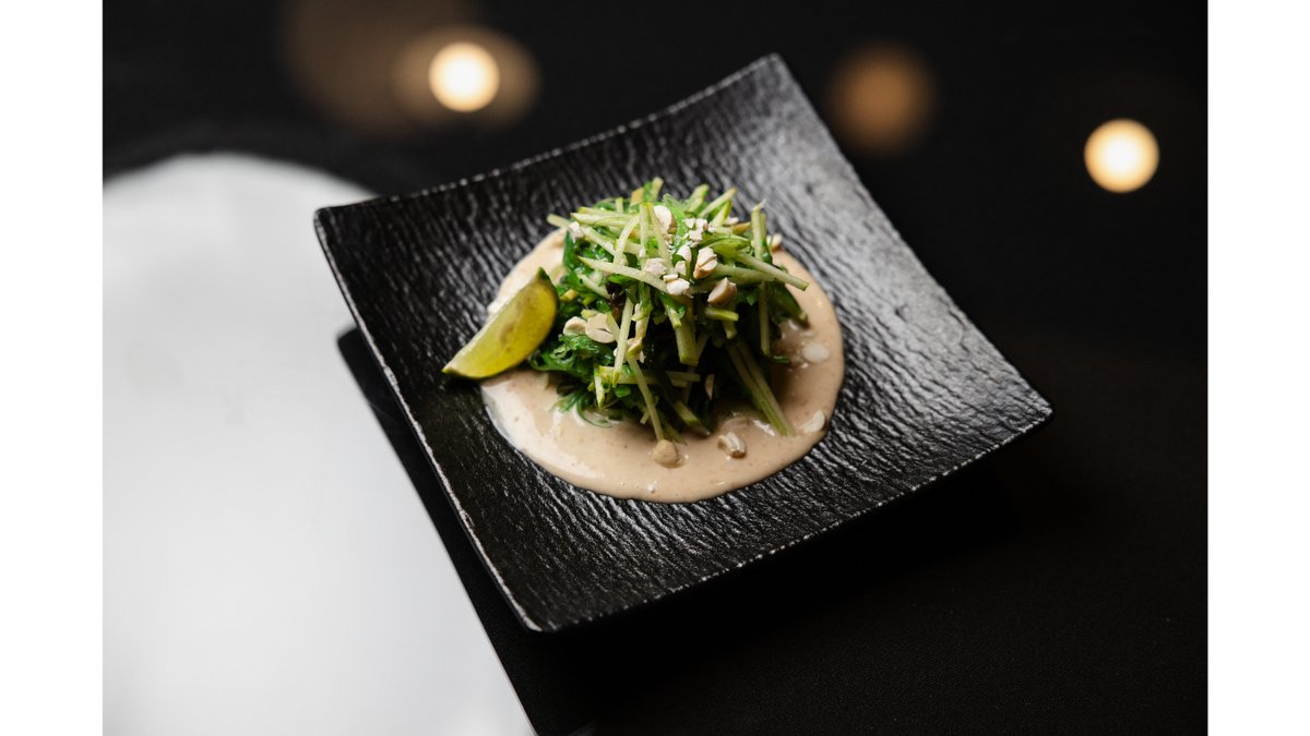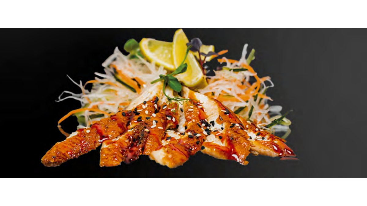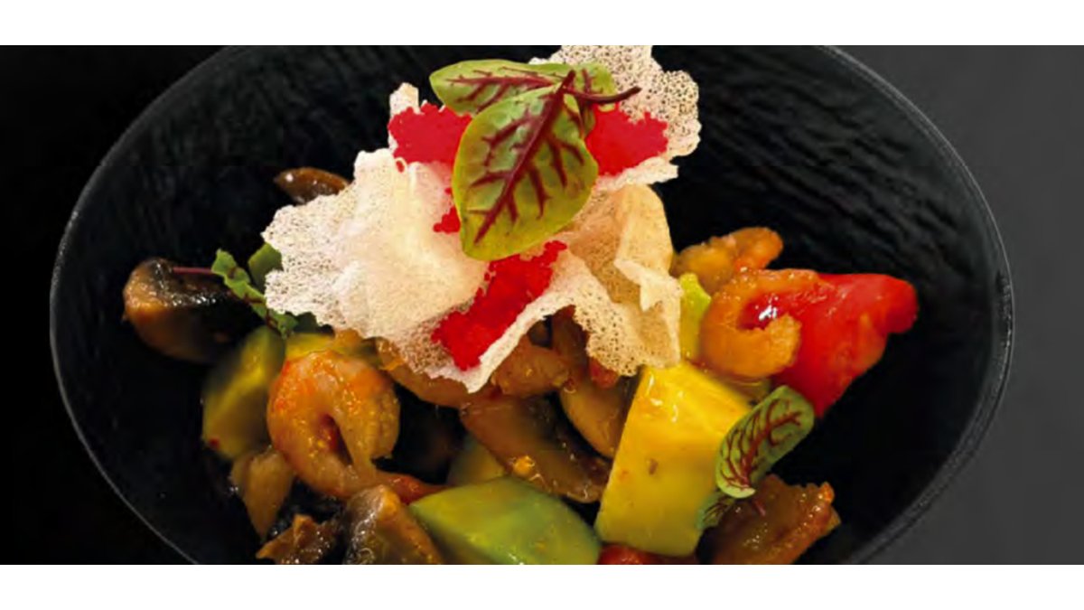 Баклажаны, помидоры, свит-чили соус, пюре манго, сливки, кунжутное масло, кинза, грецкий орех