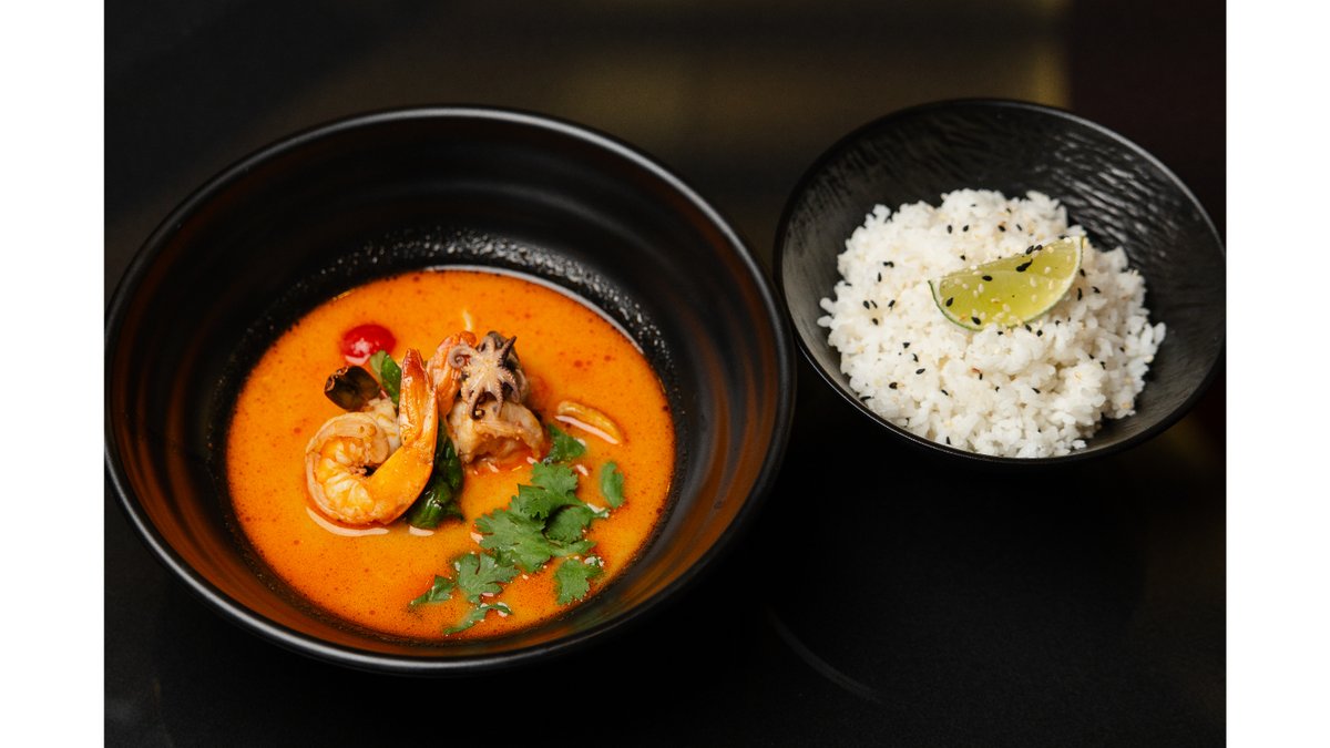 Суп на кокосовом молоке с креветками, морской коктейль, гарнир рис