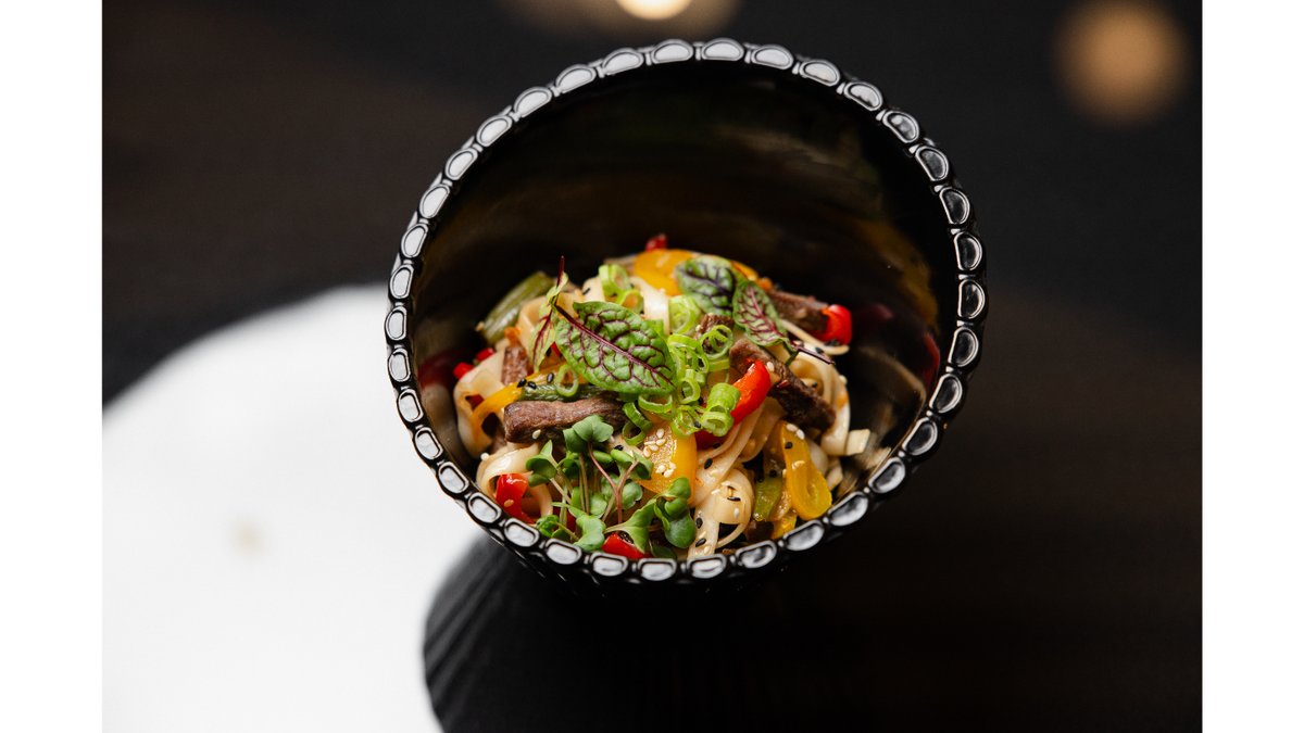 Удон, бон филе, перец светофор, стручковая фасоль, чеснок, шпинат, устричный соус, свит чили