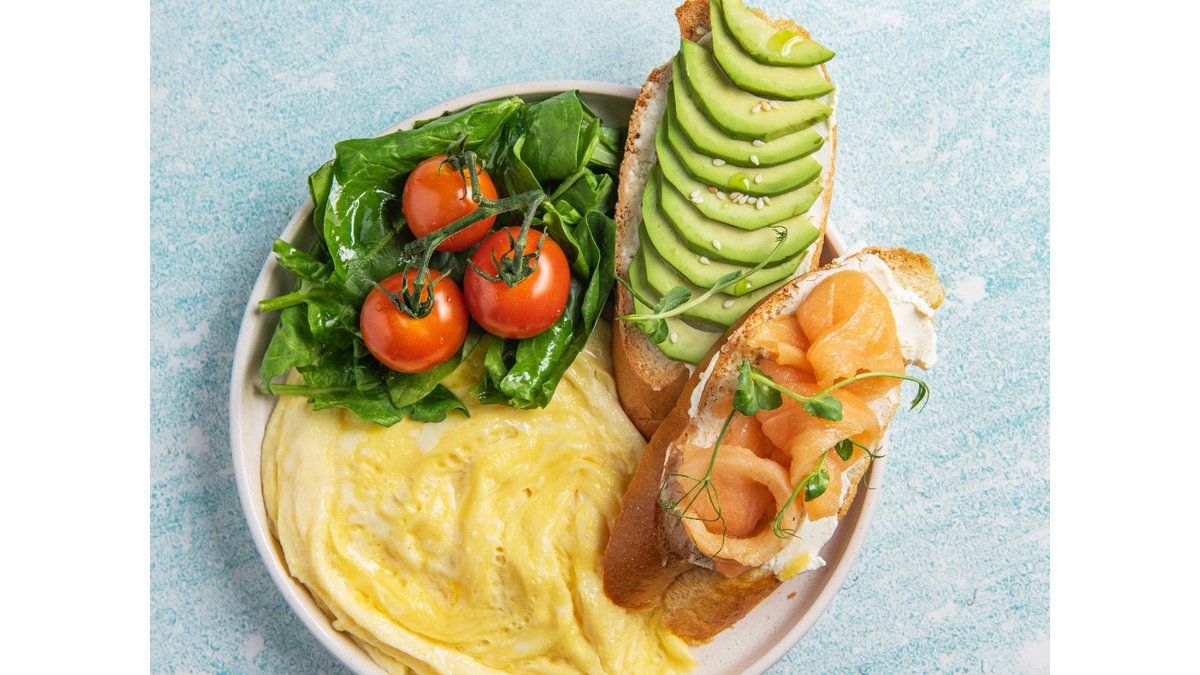 Скрембл, помидоры черри, тосты с сыром и семгой с авокадо
