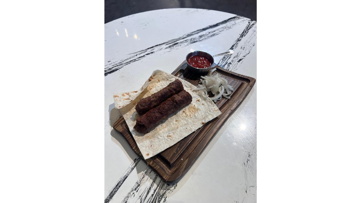 Турецкие котлетки на гриле из говядины, с запеченной лепешкой, маринованным луком и соусом