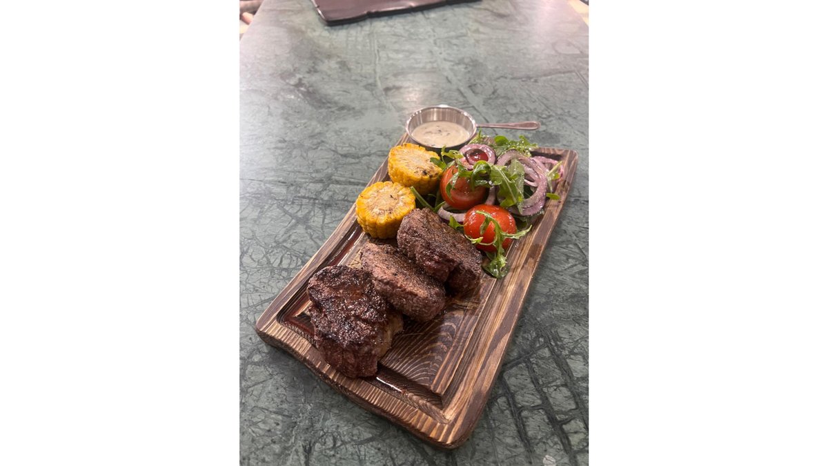 Отрез из тонкой части вырезки Подается с микс салатом, кукурузой на гриле и соусом