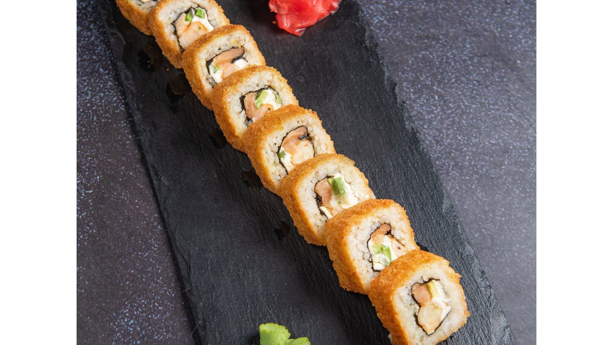 Лосось, творожный сыр, огурец, рис, нори Подается с соевым соусом, васаби, имбирь