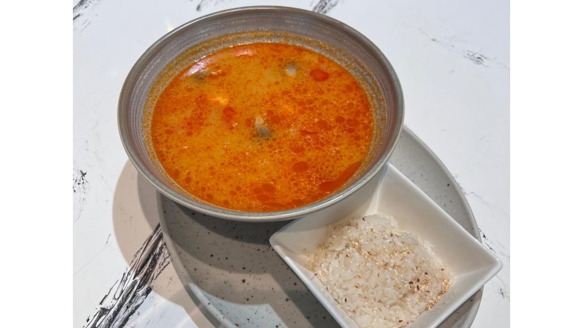 Классический том ям на кокосовом молоке с семгой, кальмарами, креветками, шампиньонами и долькой лайма