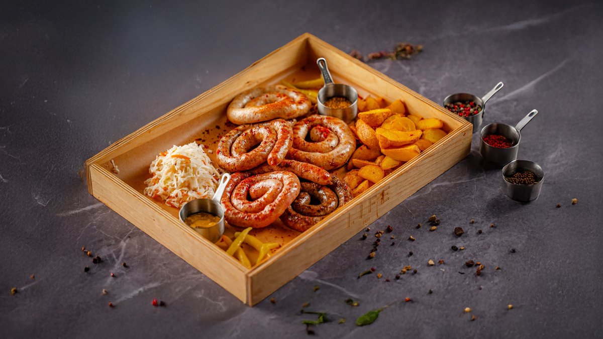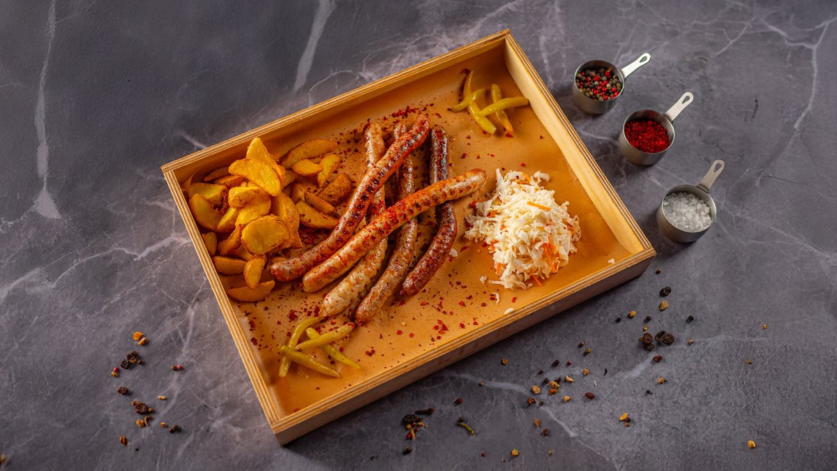 Гренки, луковые кольца, крылышки, сыр чечил, креветки, колбаски охотничьи, чипсы картофельные, начос, соус дзадзыки, сальса.