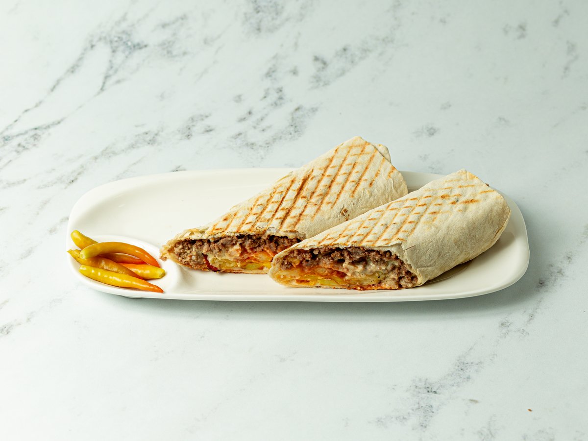 Лаваш, курица, говяжий фарш, сыр, фирменный соус, кетчуп.