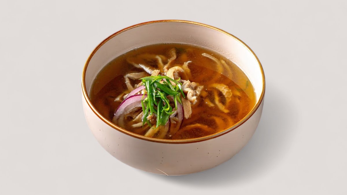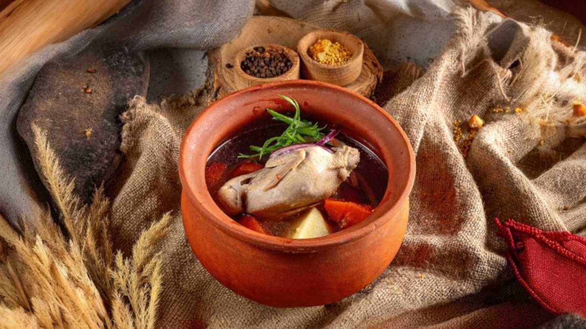 Суп приготовленный из сухожилий с добавлением бидая и казы ,предлагает насыщенный вкус и интересное сочетание текстур