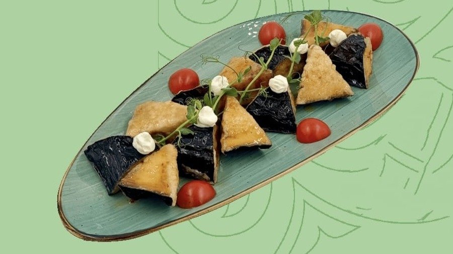 Черри, жаренные баклажаны, творожный сыр, кисло-сладкий соус