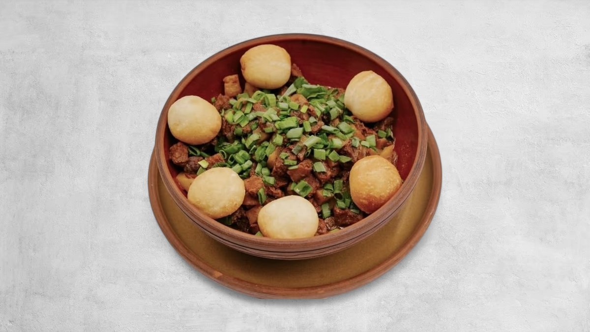 Нан бауырдак из говяжьего мяса, бульон, фри, вареный курт, перчик, соус