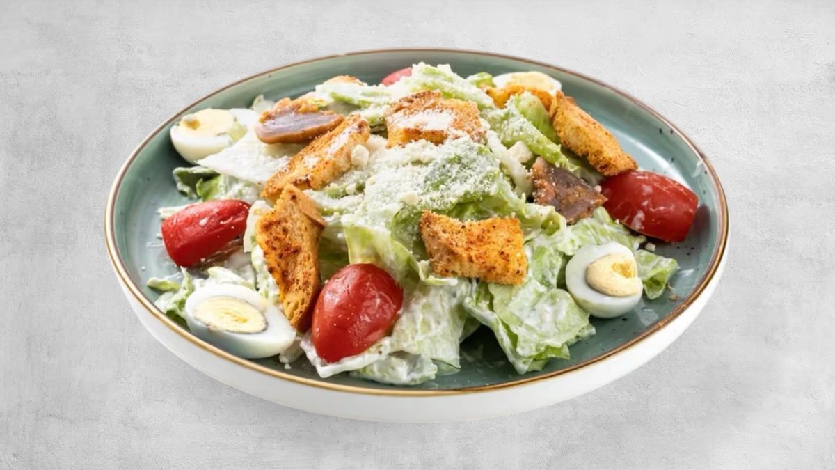 Айсберг, сын пармезан, яйцо перепелиное, сухарики, соус цезарь, конина.