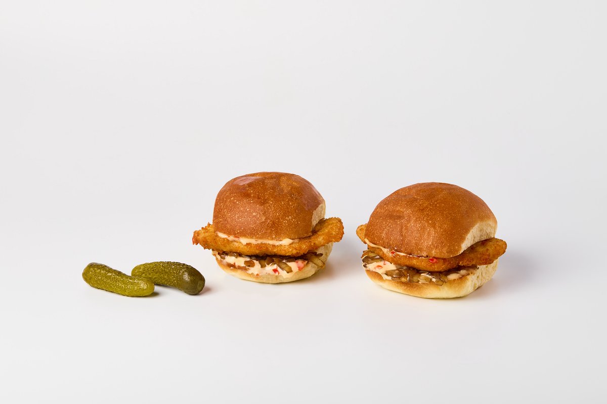 Тәтті-чили соусымен смэш-бургер Үйде жасалған картоп бөлкесі, қытырлақ тауық шницелі, қуырылған пияз және тәтті-чили соусы.