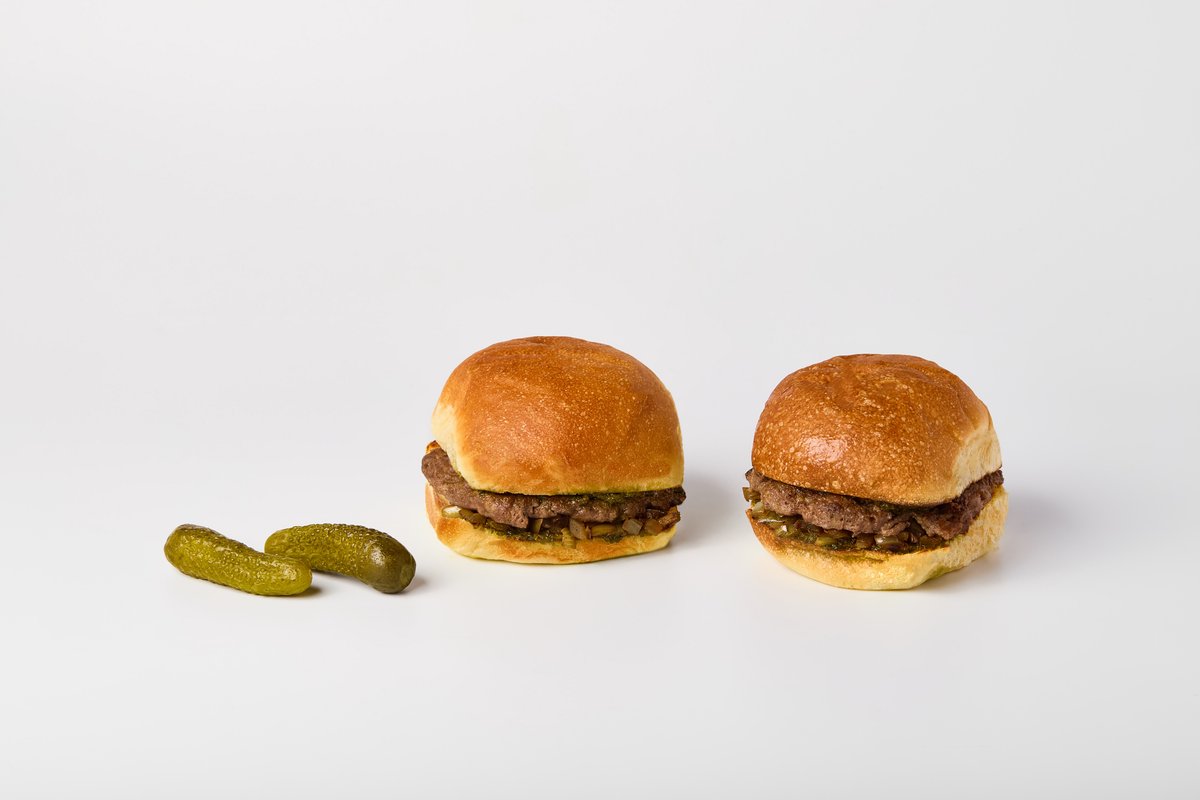 Үйде жасалған картоп бөлкесі, мәрмәр сиыр етінен жасалған смэш-котлета, песто соусымен қуырылған пияз.