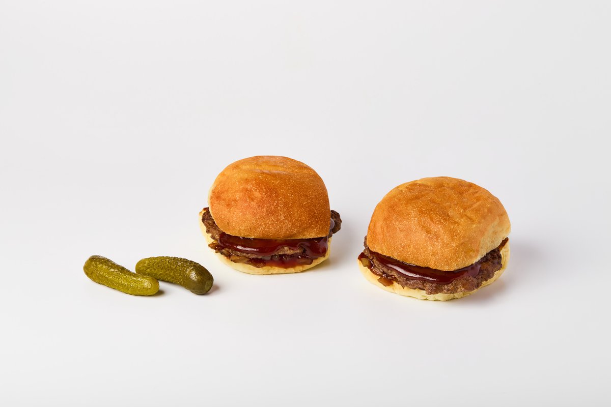 Үйде жасалған картоп бөлкесі, мәрмәр сиыр етінен жасалған смэш-котлета, балды-қыша соусымен қуырылған пияз.