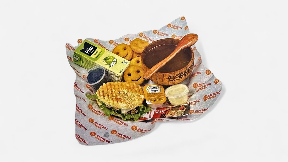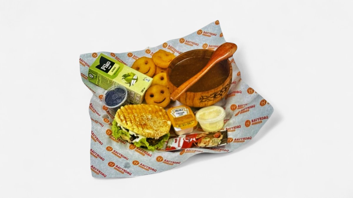 Мини классический бауырдак с говядиной,костный бульон,курт,кечуп,сырный соус,сок,фри