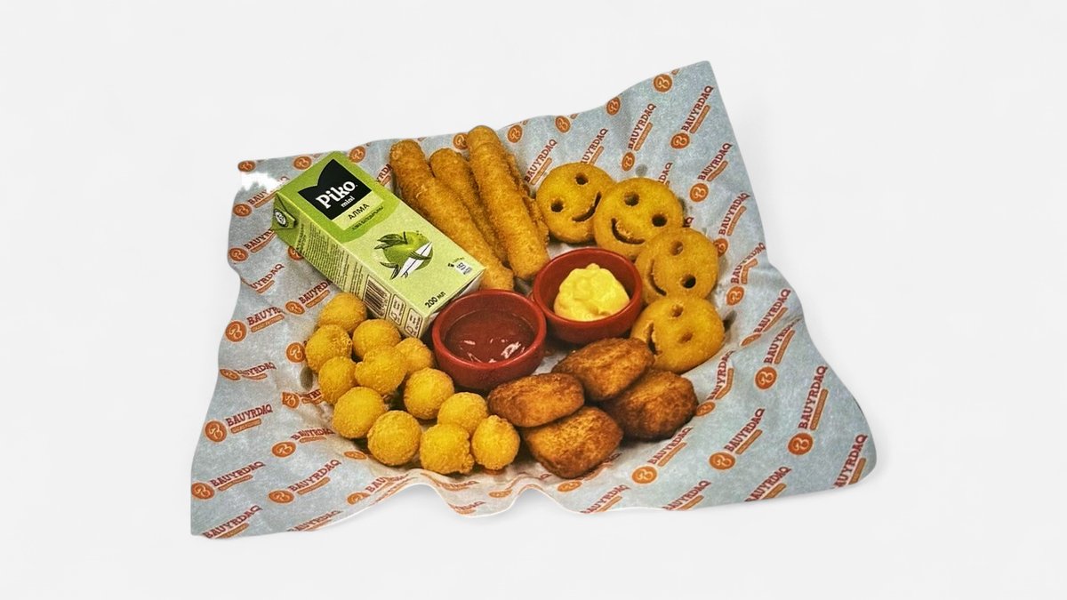 Нагетсы,картофельные шарики,сырные палочки,кетчуп,сырный соус,фри,сок.