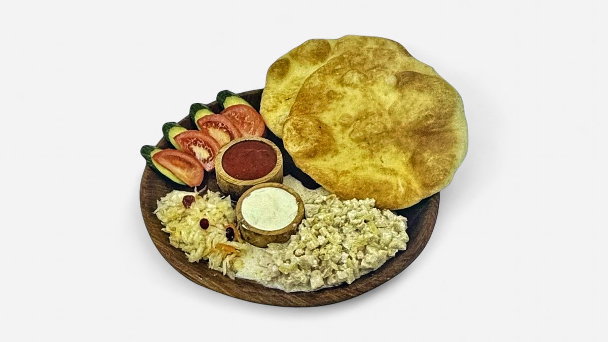 Лепешка-шелпек, курица в соусе,квашеная капуста,помидор,огурец,сметана,соус