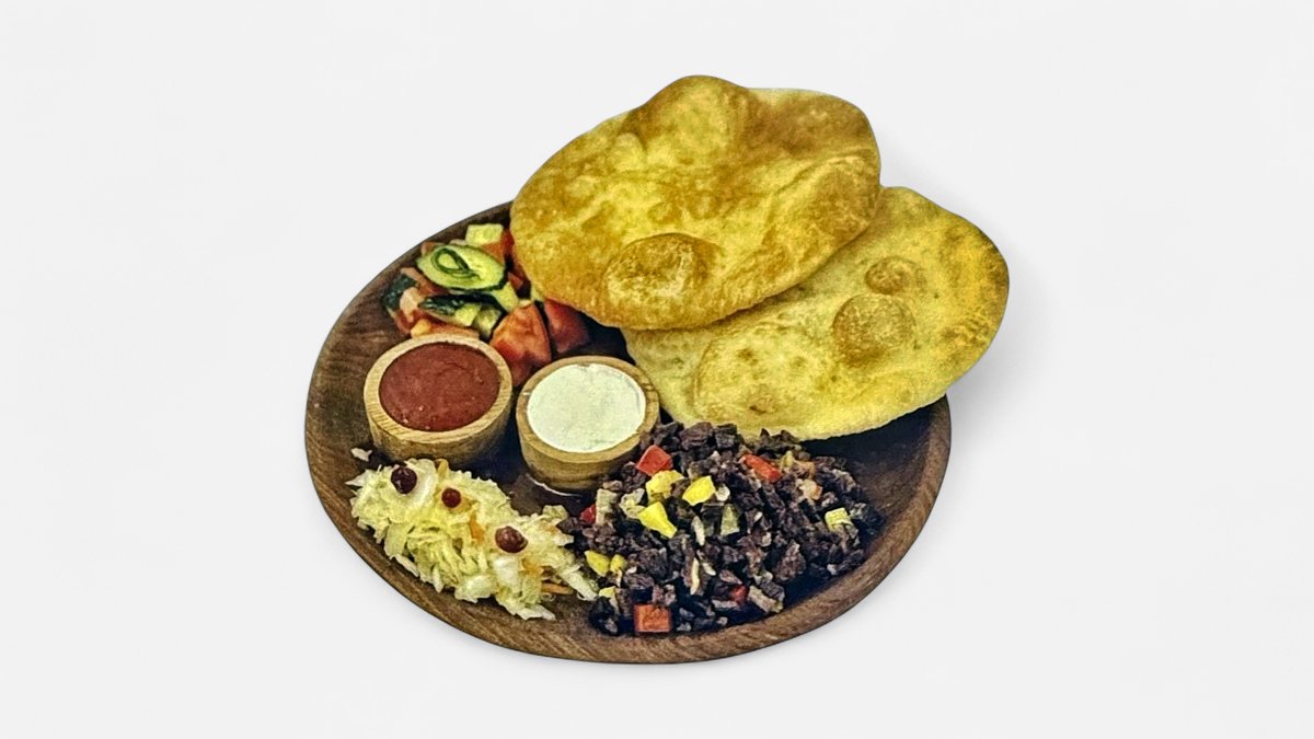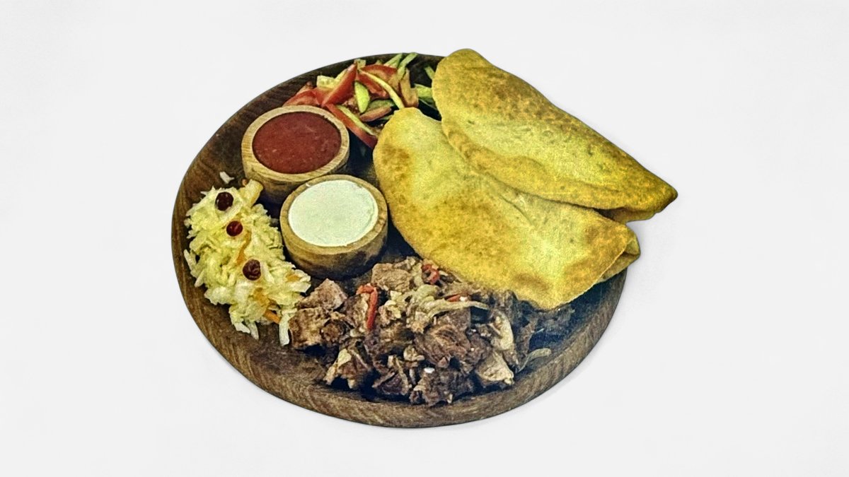 Лепешка-шелпек,тушенная говядина в соусе,квашеная капуста,помидор,огурец,сметана,соус